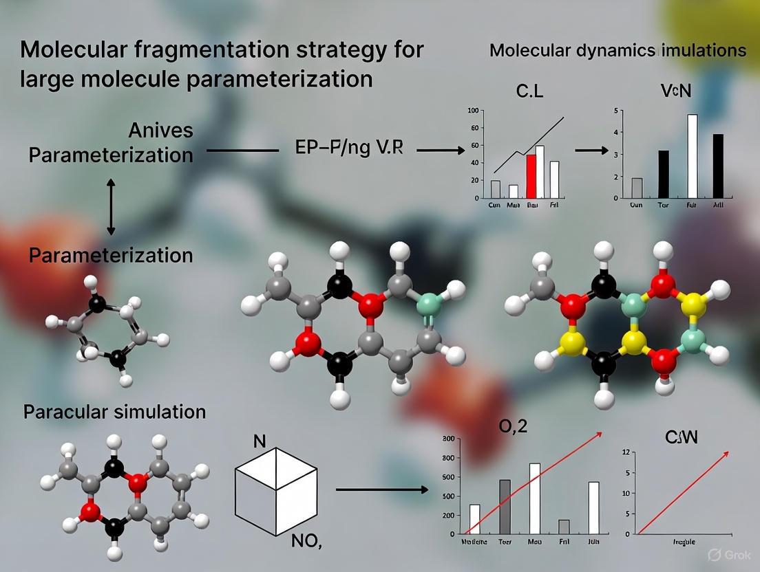 Parameterizing large molecules for accurate molecular dynamics simulations is a central challenge in computational drug discovery. This article provides a comprehensive analysis of modern molecular fragmentation strategies, which break down large, complex systems into smaller, computationally tractable fragments. We explore the foundational principles driving this approach, detail cutting-edge methodological implementations—including graph-based fragmentation algorithms and hybrid quantum-classical methods—and address key troubleshooting and optimization challenges. The content further delivers a rigorous validation of these strategies through comparative performance benchmarking against established techniques. Aimed at researchers and drug development professionals, this review synthesizes how advanced fragmentation methods are enabling the accurate and efficient parameterization of expansive chemical space, thereby accelerating the in silico design of novel therapeutics.