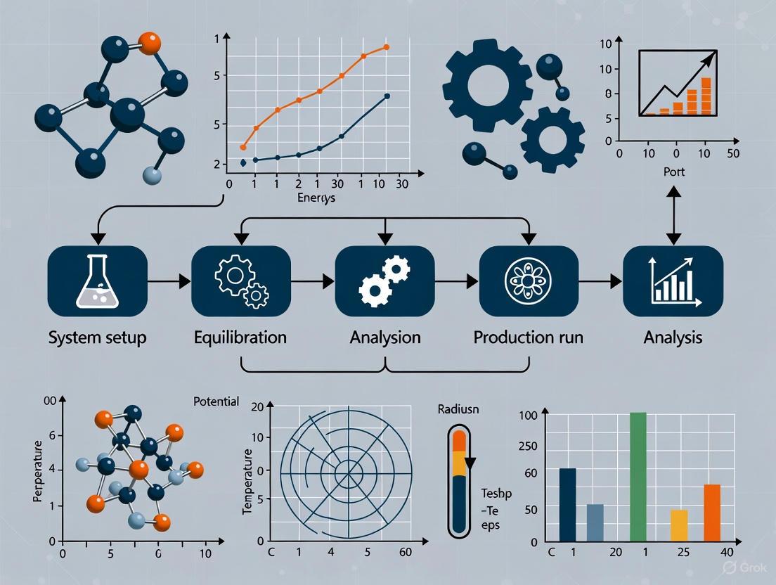 A complete MD simulation involves multiple stages that extend beyond the core integration algorithm. The typical workflow includes: