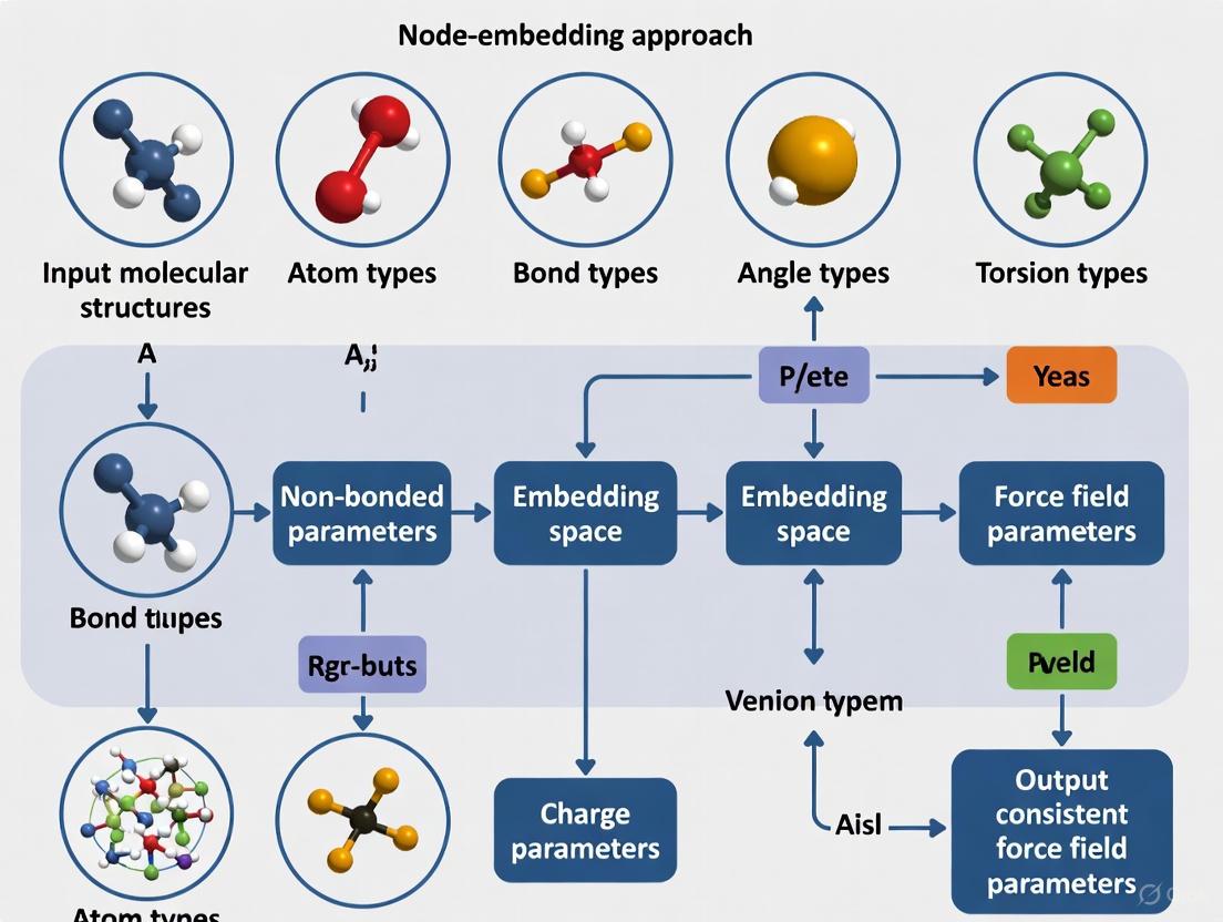 The integration of node embedding approaches with molecular graph representations establishes a powerful framework for consistent force field parameter assignment. This approach replaces traditional hand-crafted atom typing rules with data-driven parameter prediction directly from molecular graphs [14].